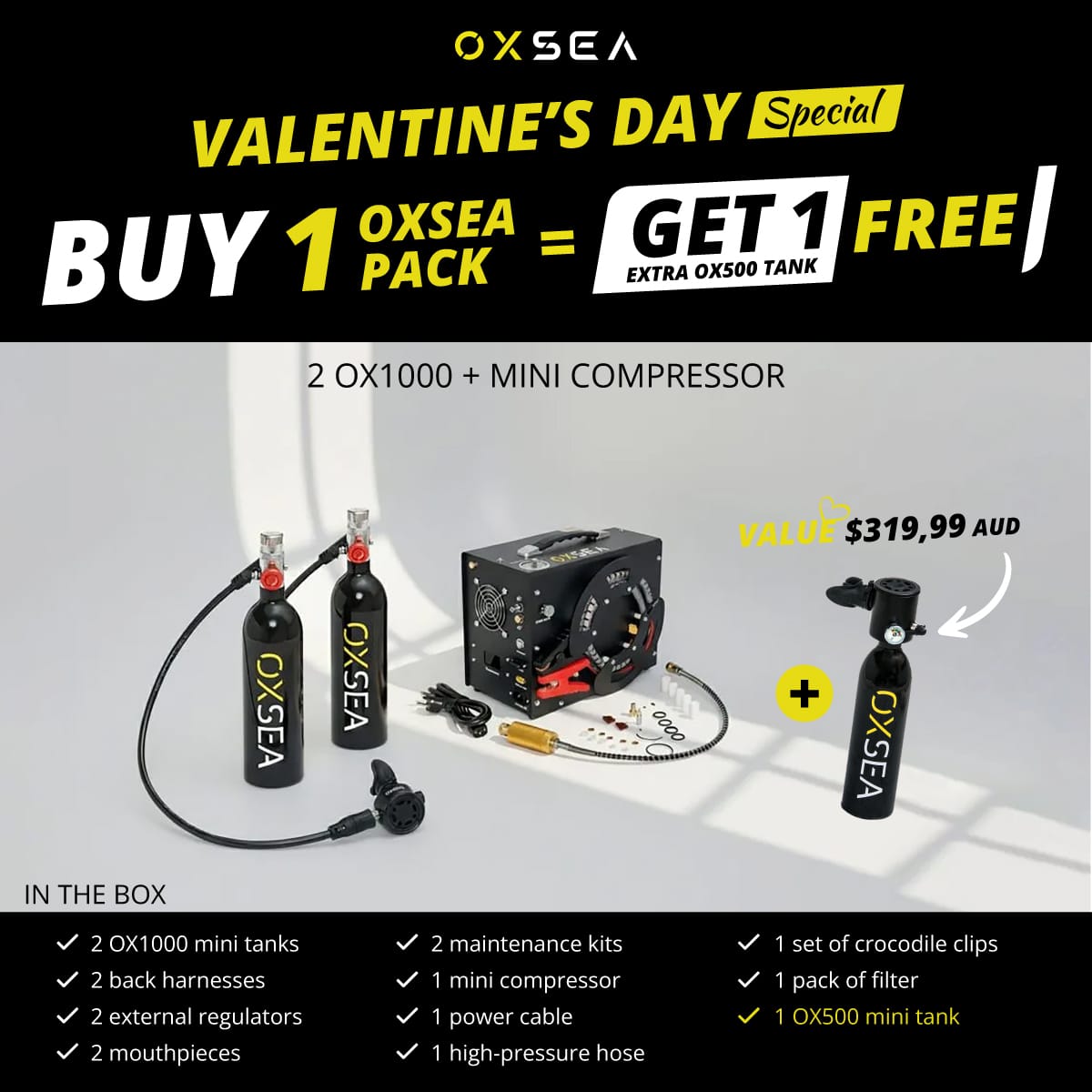 designed for explorers who value range, safety, and freedom. This DUO pack includes two OX1000 tanks and the OXSEA Mini Compressor.