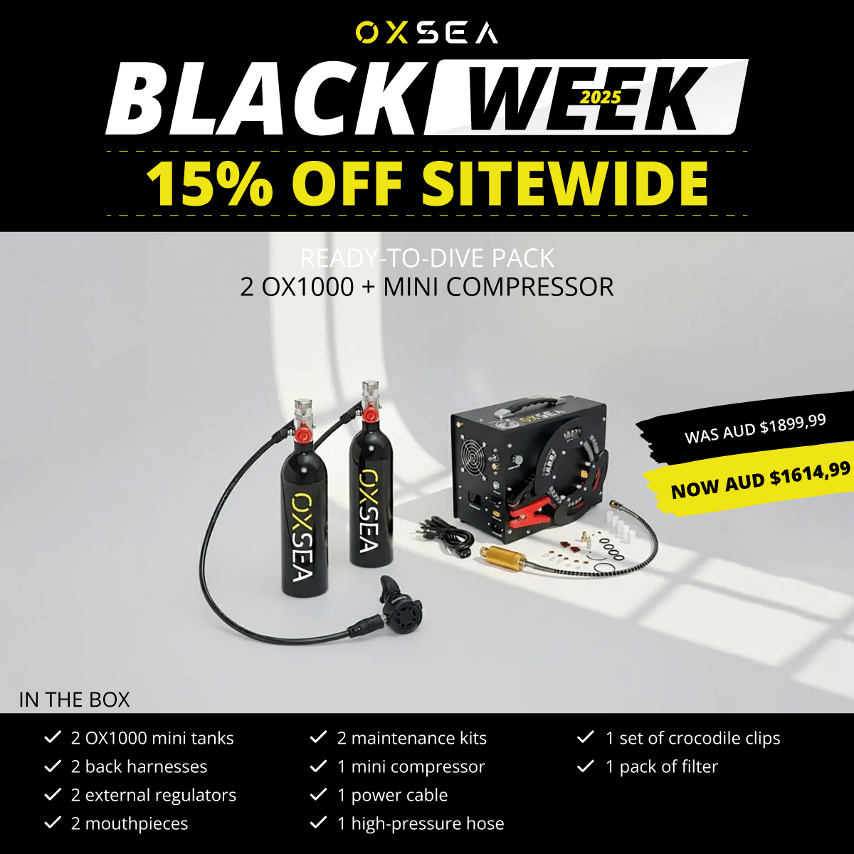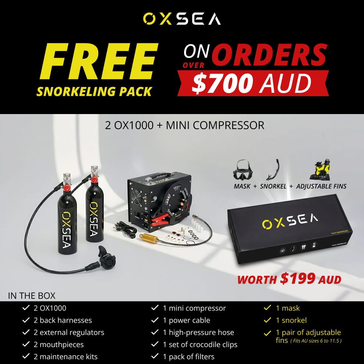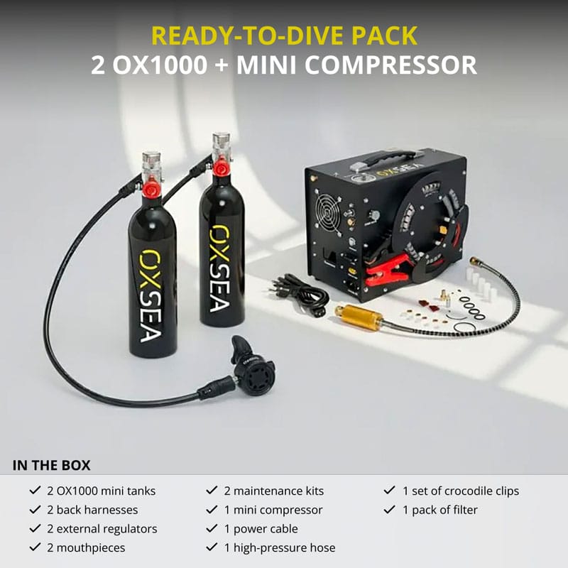designed for explorers who value range, safety, and freedom. This DUO pack includes two OX1000 tanks and the OXSEA Mini Compressor.