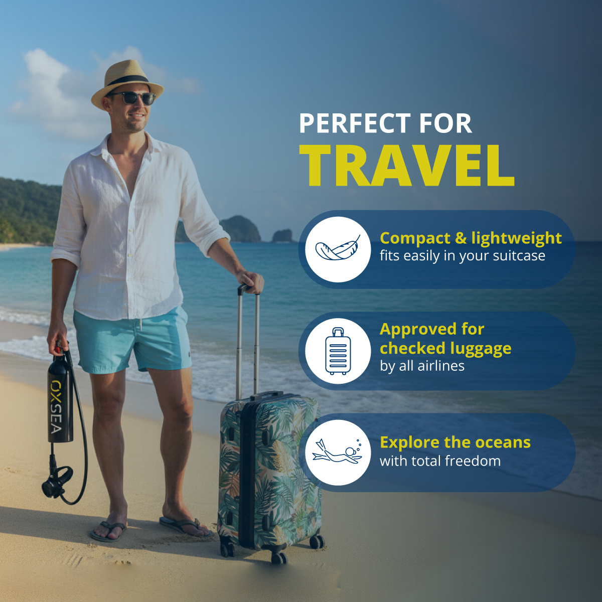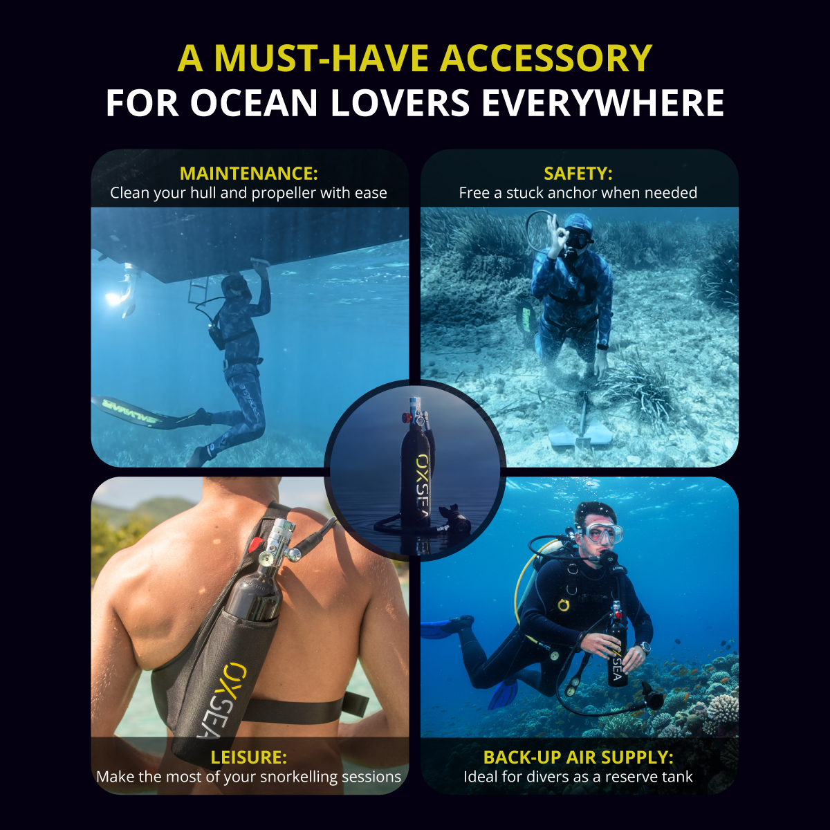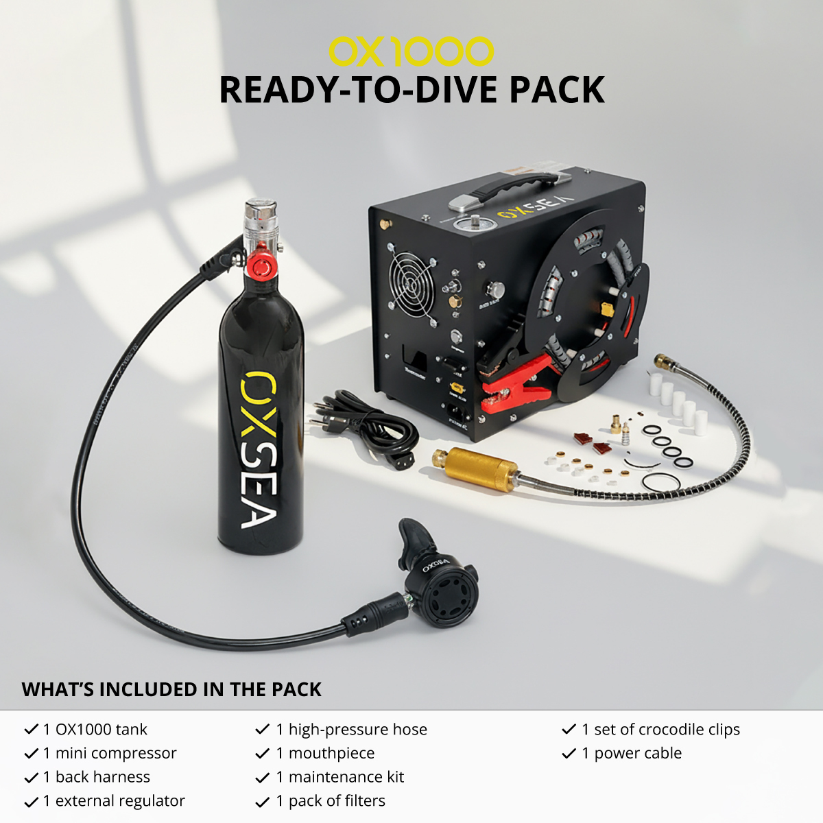 designed for explorers who value range, safety, and freedom. This pack includes the OXSEA Mini Compressor for quick refills.