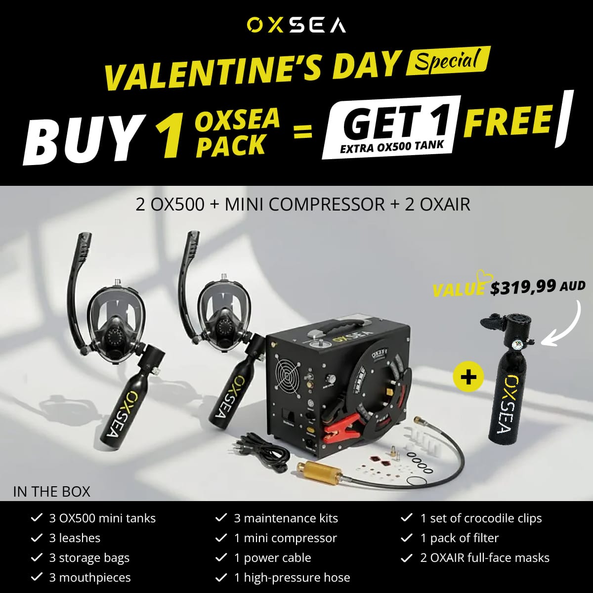 designed for explorers who value simplicity, safety, and freedom. This DUO pack includes two OX500 tanks, the OXSEA Mini Compressor, and two OXAIR masks.