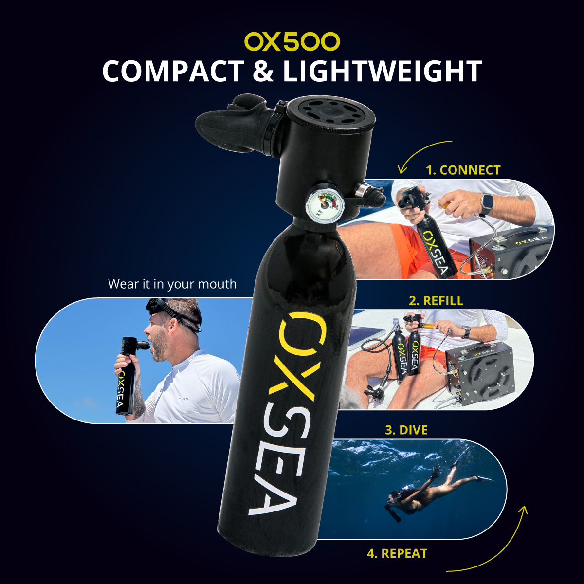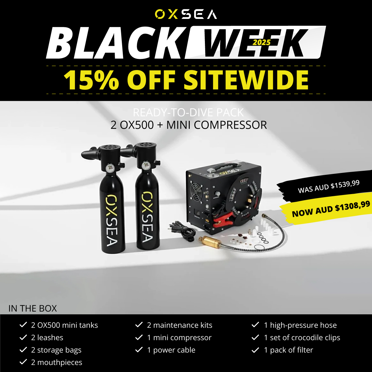 designed for explorers who value simplicity, safety, and freedom. This DUO pack includes two OX500 tanks and the OXSEA Mini Compressor.