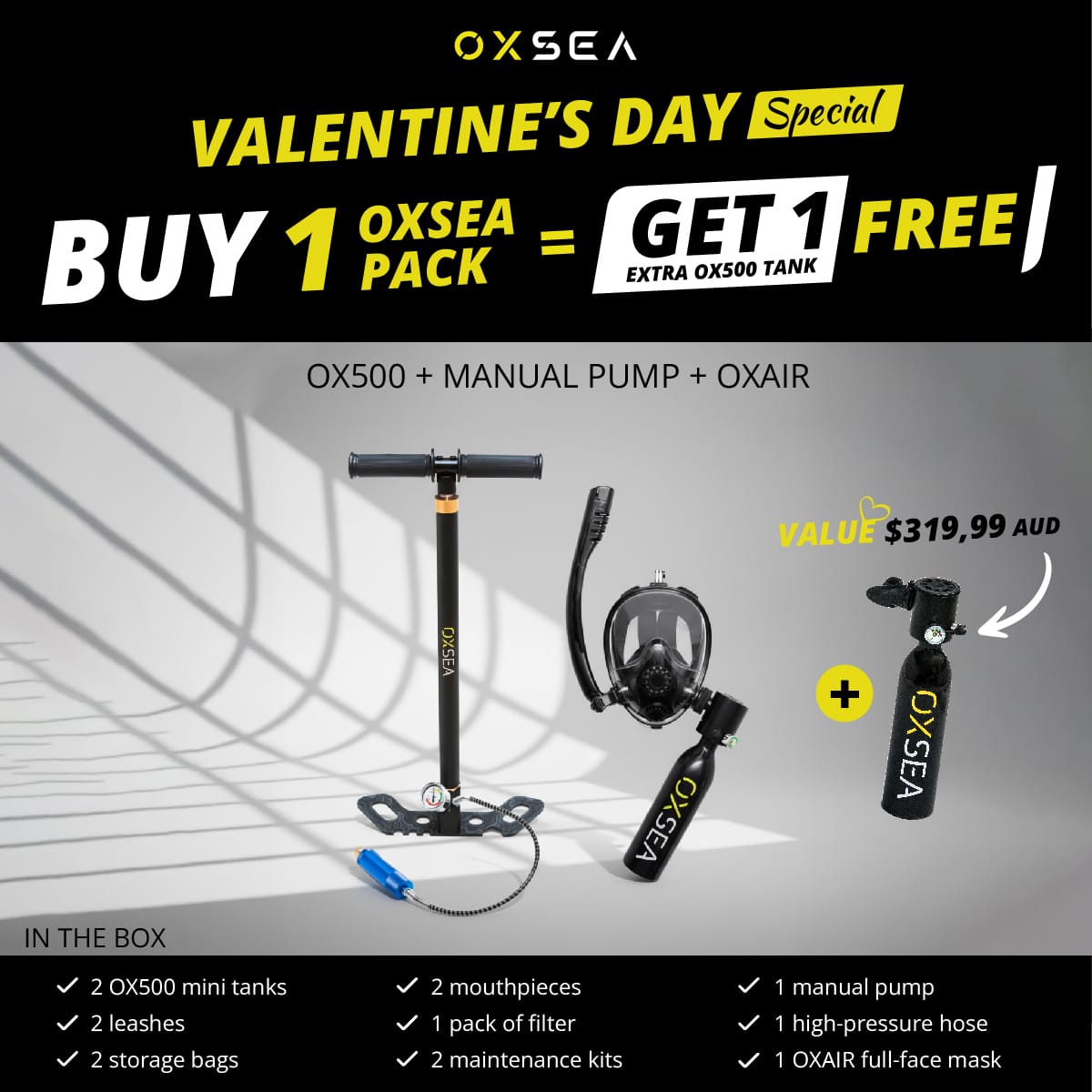 and this pack includes the OXSEA Hand Pump and the OXAIR mask so you can refill anywhere and enjoy comfort around the water — designed for simplicity, safety, and freedom.