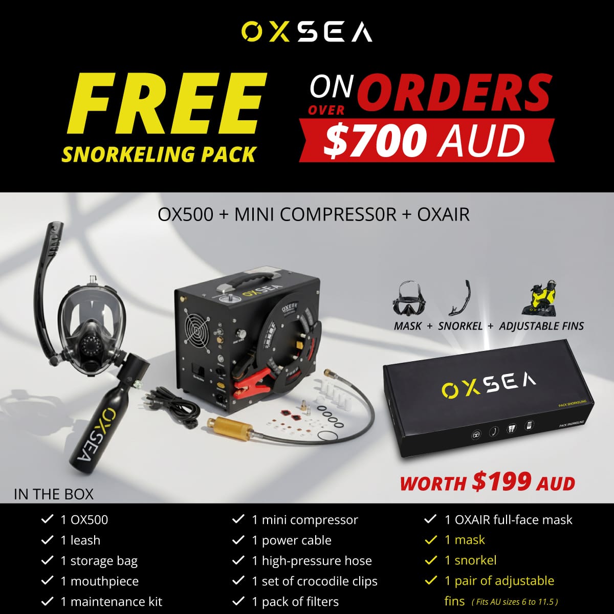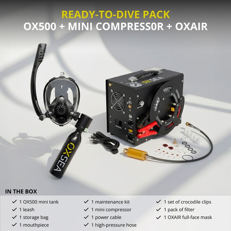 designed for explorers who value simplicity, safety, and freedom. This pack includes the OXSEA Mini Compressor and the OXAIR mask.