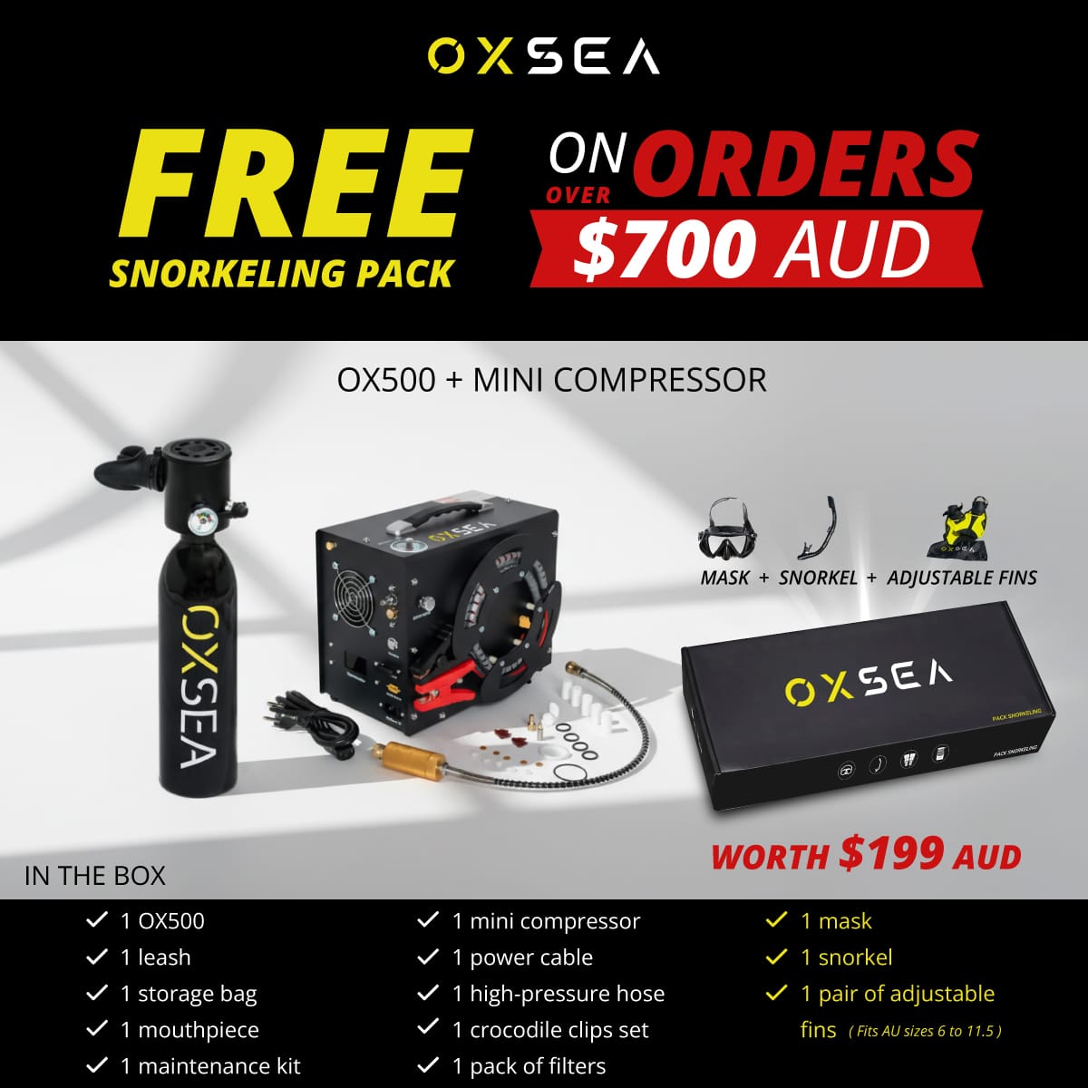 designed for explorers who value simplicity, safety, and freedom. This pack includes the OXSEA Mini Compressor for quick refills.