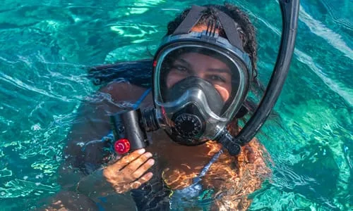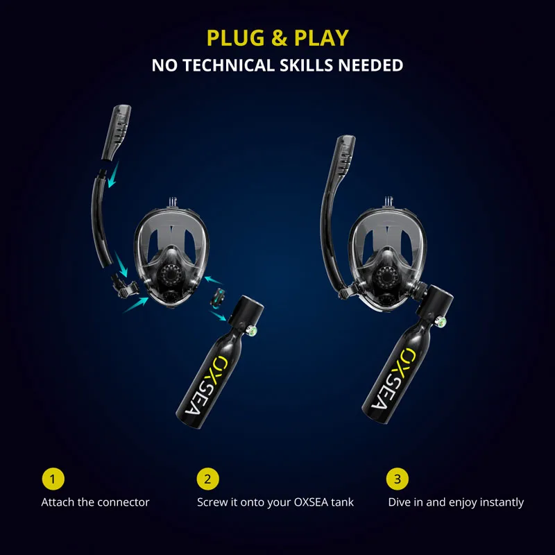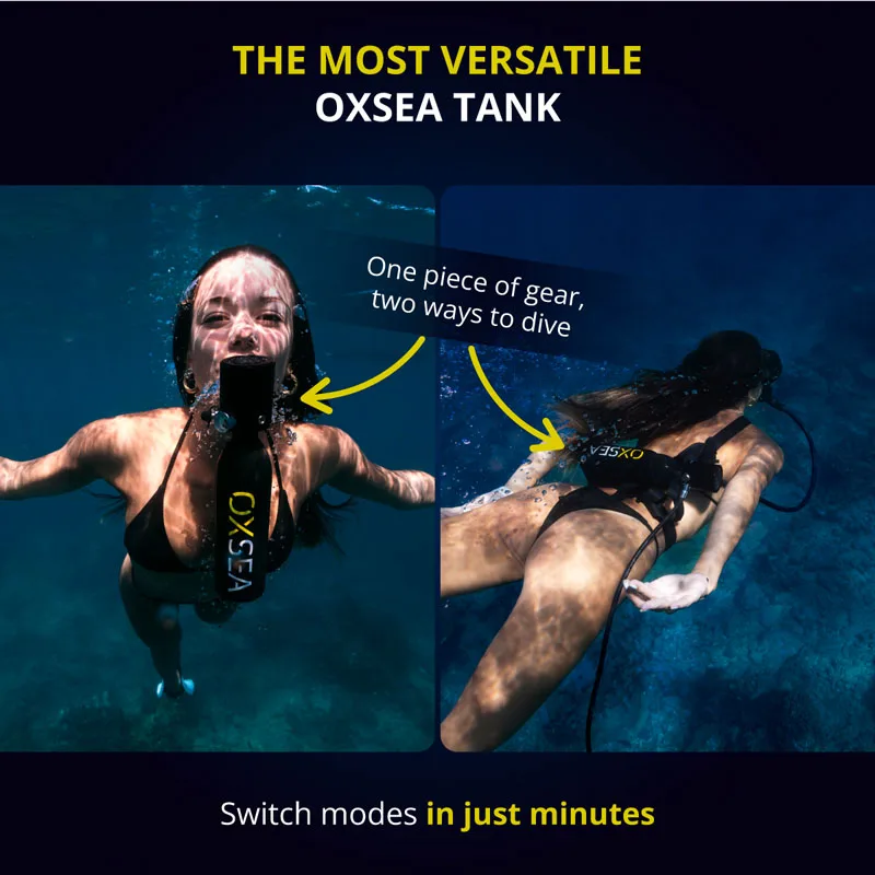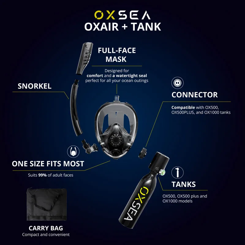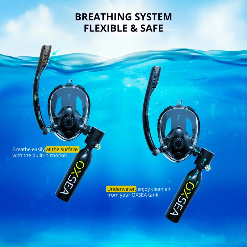 OXAIR Mask (Hybrid Use): At the surface, you breathe through the snorkel; once you submerge, the tank air automatically takes over. Two modes in one.