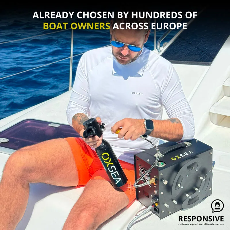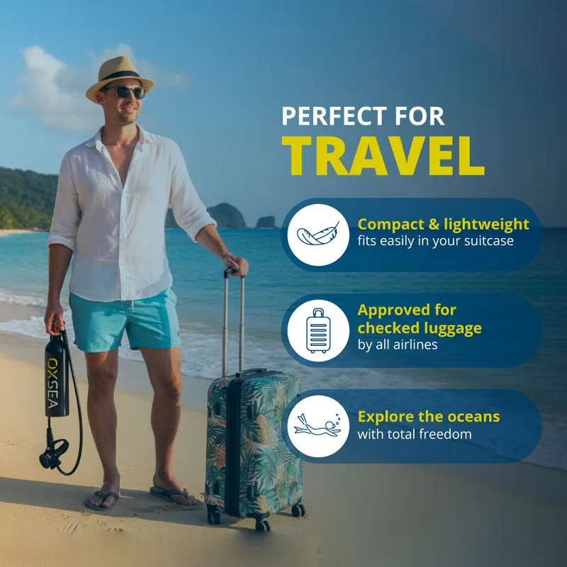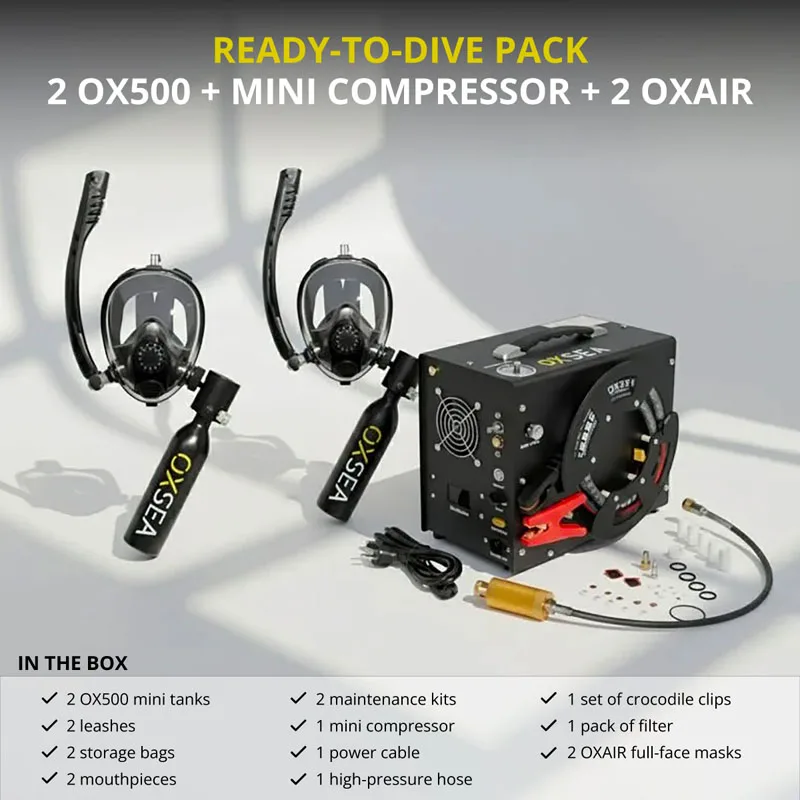 designed for explorers who value simplicity, safety, and control. This DUO pack includes two tanks, the OXSEA Mini Compressor, and two OXAIR masks.