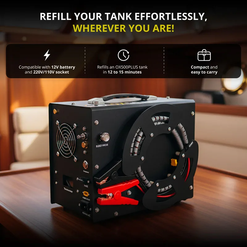 Recharge Anywhere: mini compressor included. Runs on 12 V or 220 V. Refill each 0.5 L tank in about 12 minutes. Also compatible with a filling-station transfer adapter.