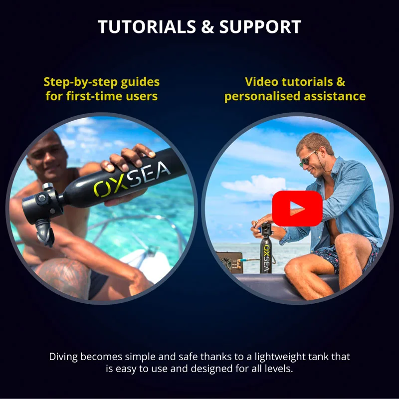 • Compliance & refilling (AU): manufactured to international cylinder standards (e.g. ISO 7866 / DOT) and supplied for use in Australia. Refill breathable air only meeting AS/NZS 2299.1 (breathing air specification, equivalent in practice to EN 12021). Use OXSEA pump/mini-compressor or a transfer whip from a standard dive cylinder.