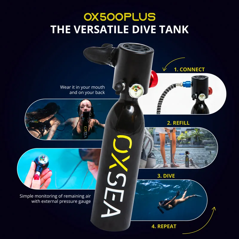 The OX500Plus can be used with a mouthpiece or an external regulator. It also comes with a back harness and an external gauge for added comfort and safety.